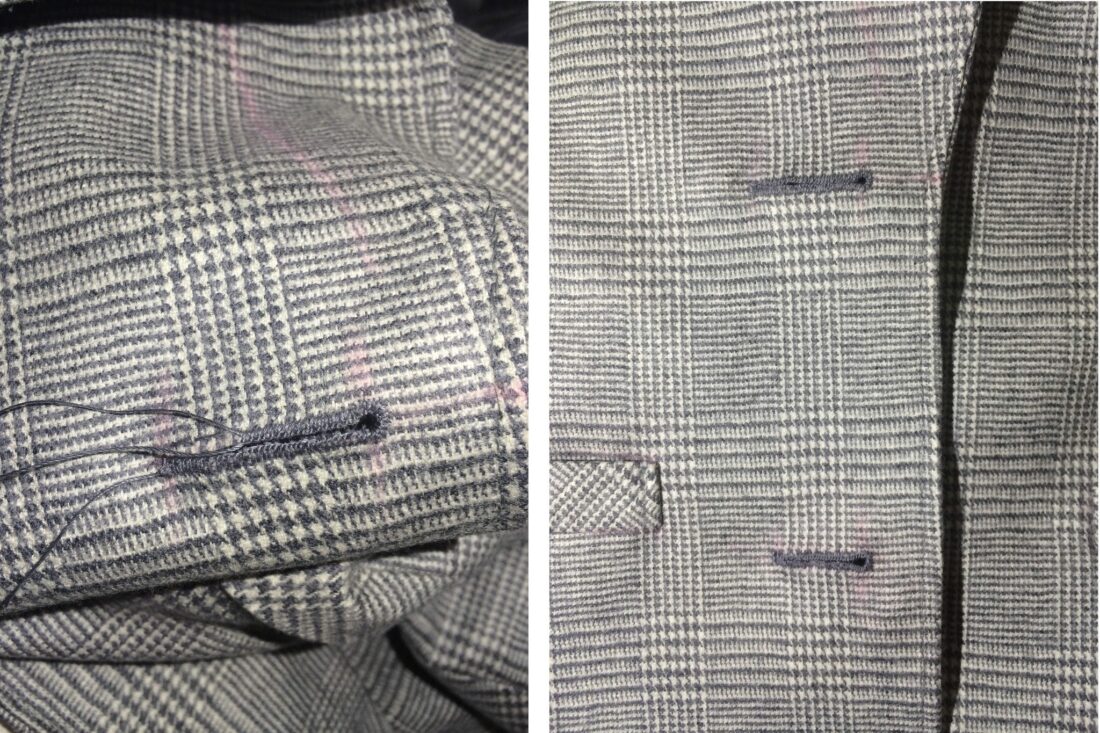 これはフロント側のボタンホール。糸が何本も出てるのは芯糸を増やしてるからです。