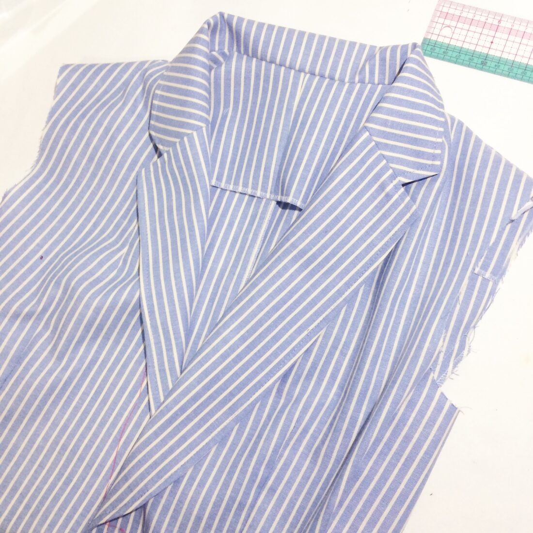 一着目はこのタンガリーコットンを使用した水色ストライプのシャツジャケット。