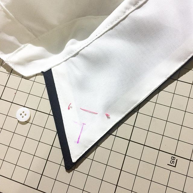 撥水加工の生地で二枚衿+ボタンダウンのシャツブラウスを作ってみました。