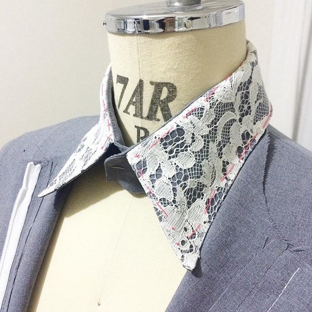 シャツカラーにはラッセルレースを重ねたデザインにしました。