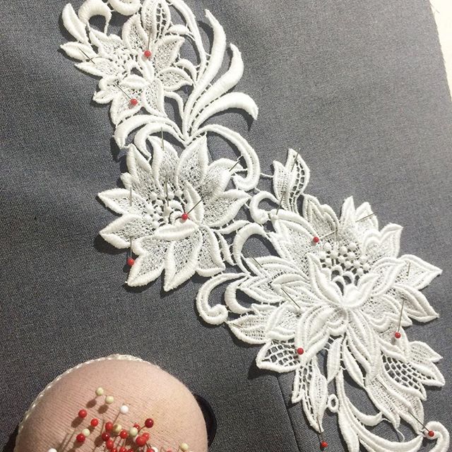かなり大き目のフラワーレースモチーフを身頃の左右に装飾しました。