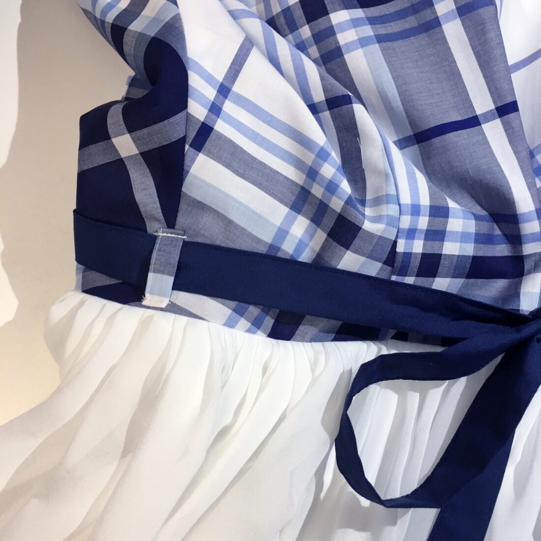 この前メイキングを載せたイタリアンコットンドレスにネイビーのリボンをつけました。