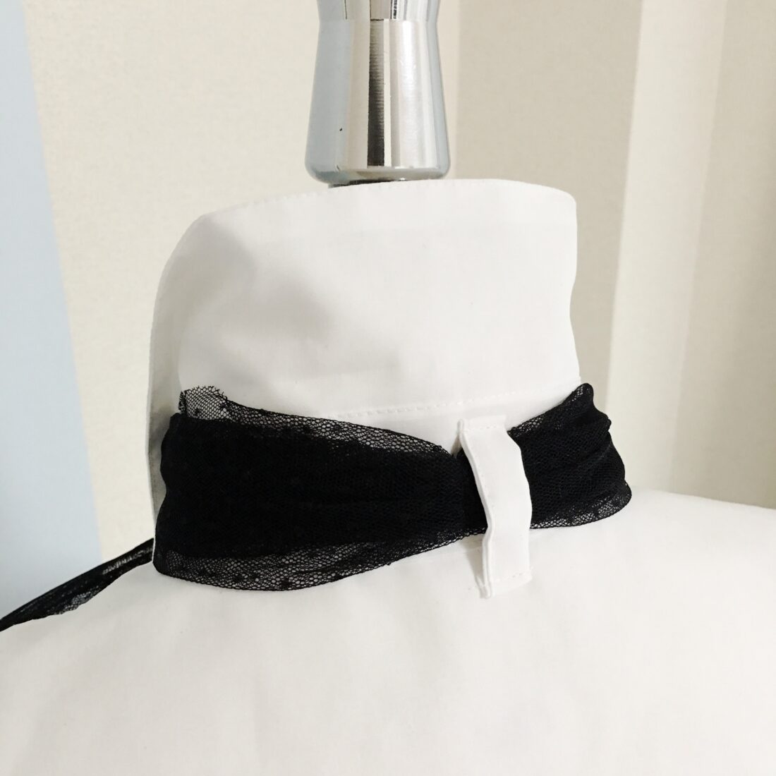 チュールリボンは有無両方で切れるようにループを衿裏に付けました。