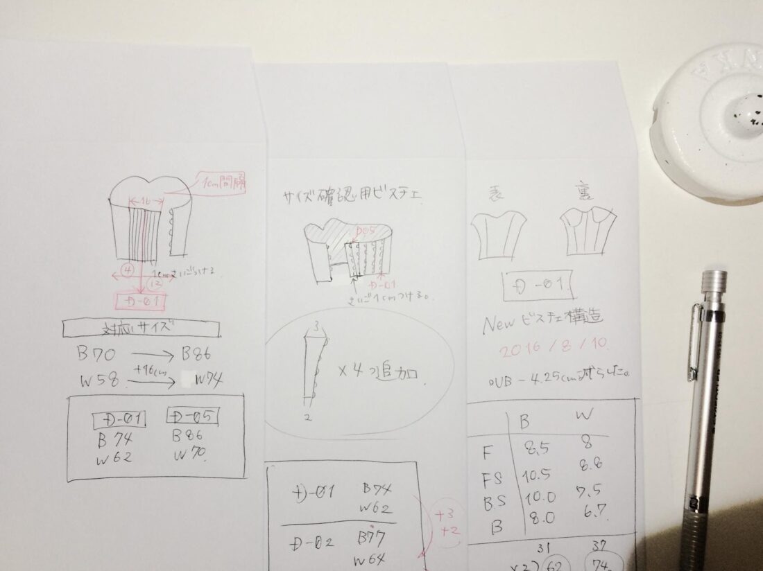 Making Bustier Pattern Saturday, August 20th, 2016 新しい構造が固まったのでビスチェを全部パターンメイキングし直しました。 今裏ビスチェの新構造を縫い試しているけど縫い手順に迷ってる。 どうアンダーバストのワイヤーを入れるかで悩み中。 前よりも断然本格的なドレス構造になったのと、ワイヤーの突き抜け防止が出来そうなのでかなり良くなってるはず。 とりあえずレースのビスチェを作ってみて着心地とか修正点とか見直すつもり。 あとやっぱりブルーグレイのロングチュールスカート作ろうかな。