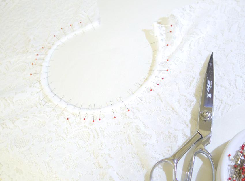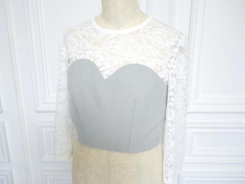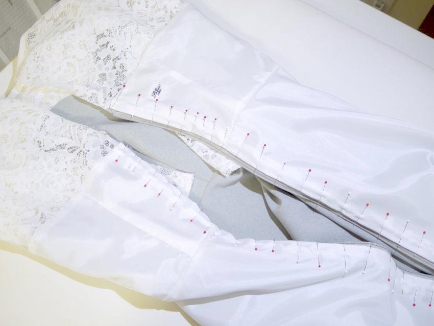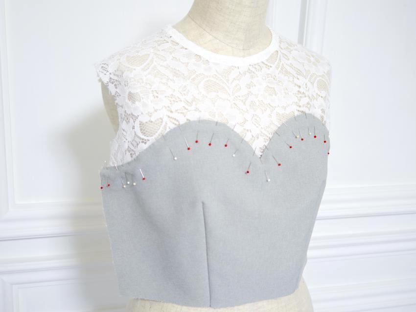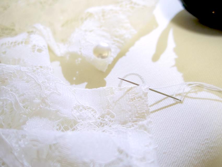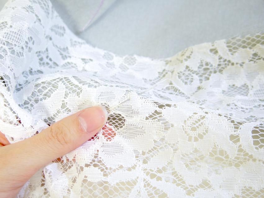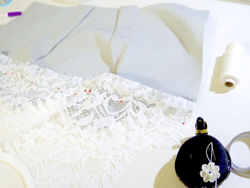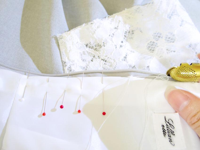 裏側からレースヨークとライトグレイの身頃を縫い合わせ。