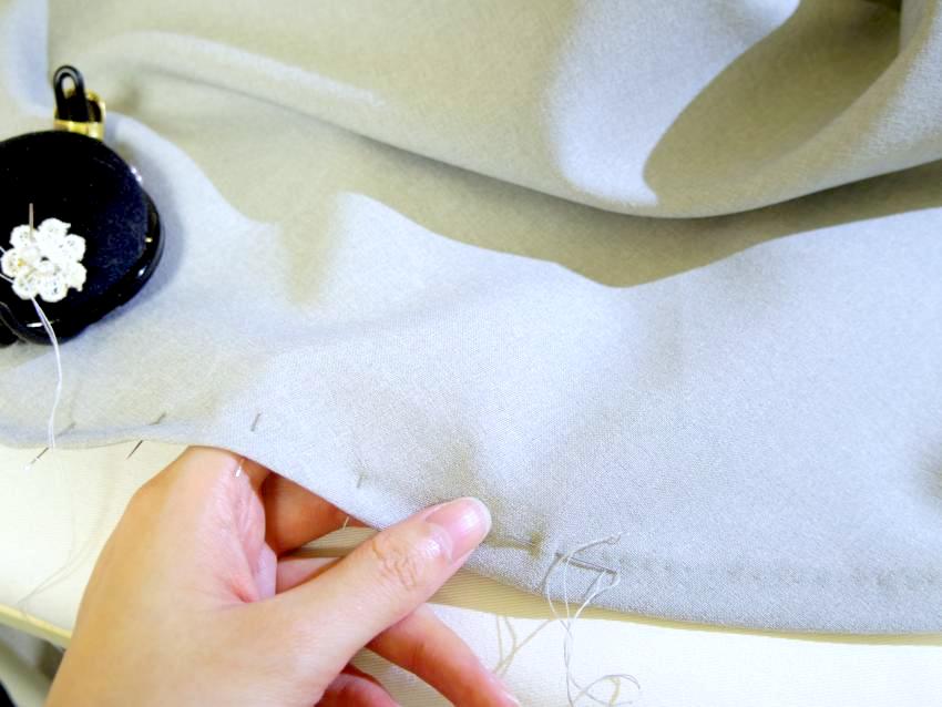 次はスカートの裾処理。これも手縫いで縫い目が表に出ない星留めステッチで処理をして行きます。