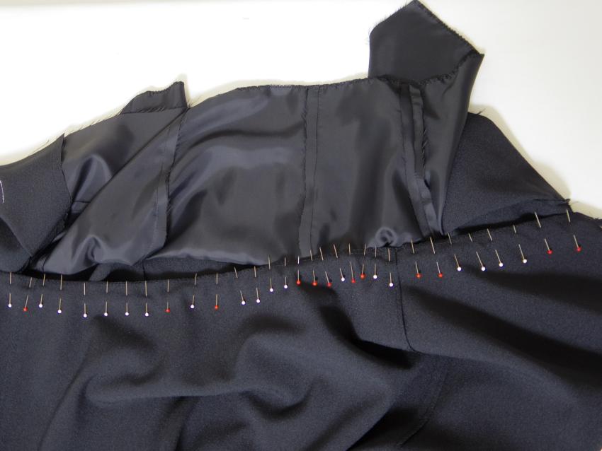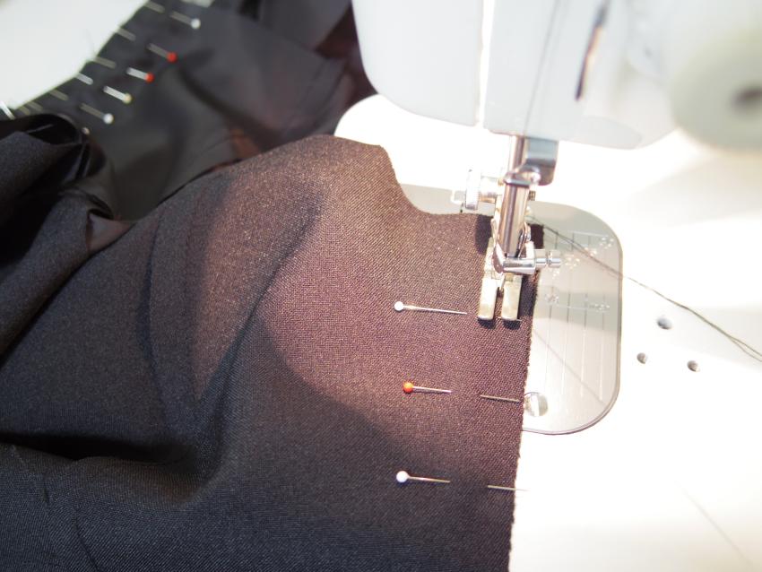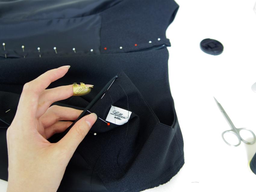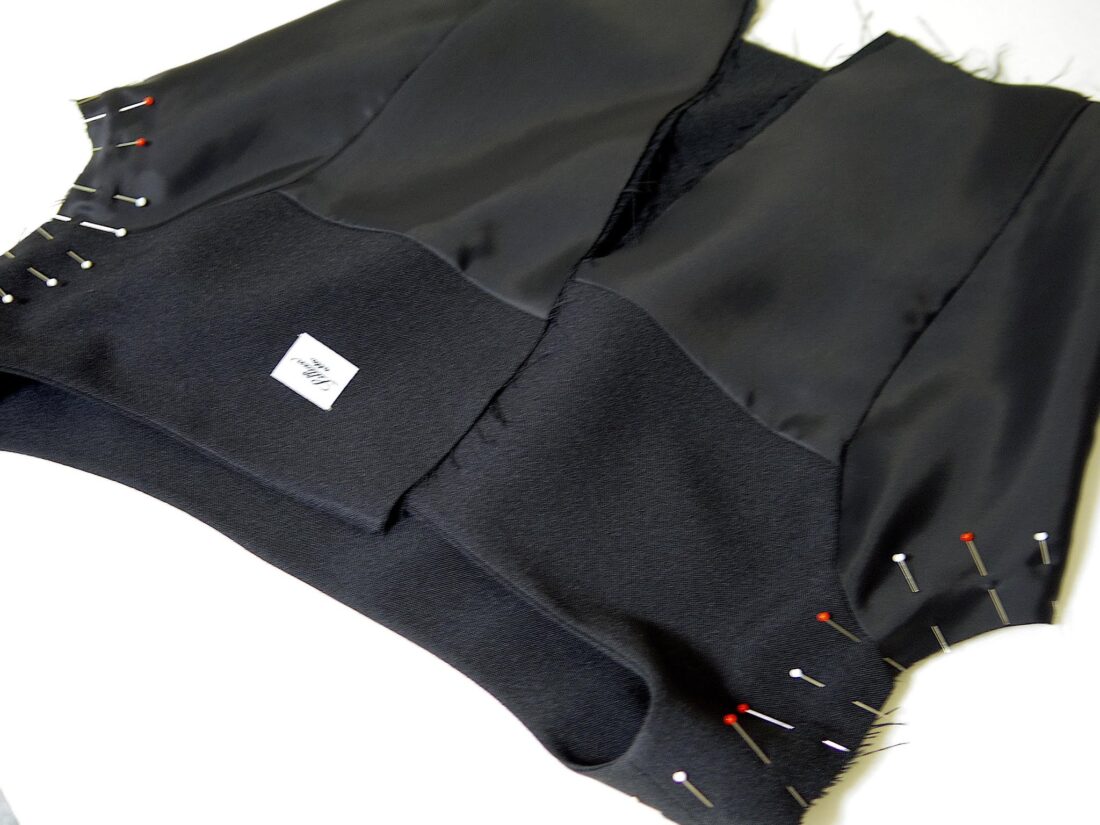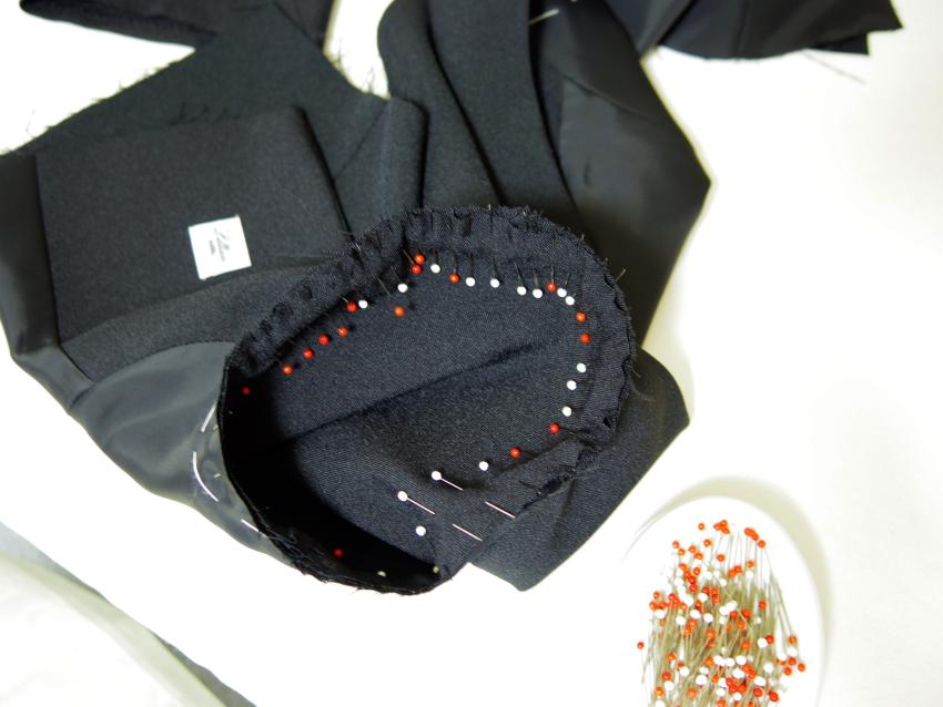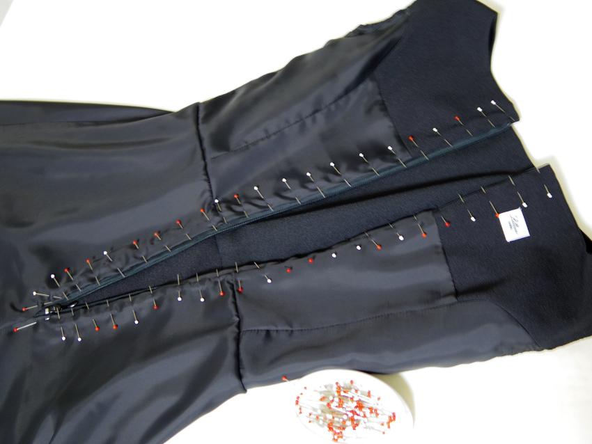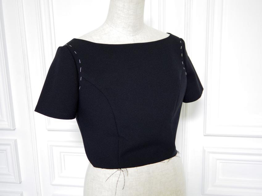 Making Custom Classic Dress Monday, August 6th, 2018 ご注文頂いた総裏仕立てのカスタムデザインクラシックドレスです。 ブラックカラーにボートネックライン、キャップスリーブ、 スカートはストレートフレアにミモレ丈でお仕立てしました。 組み立て。 身頃完成。 袖口を星留め処理。 ピンで袖山いせ込み。 上半身完成。 スカート付け。 ファスナー付けと手縫いで裏処理。 襟ぐり側処理。 裾を星留め処理して完成。