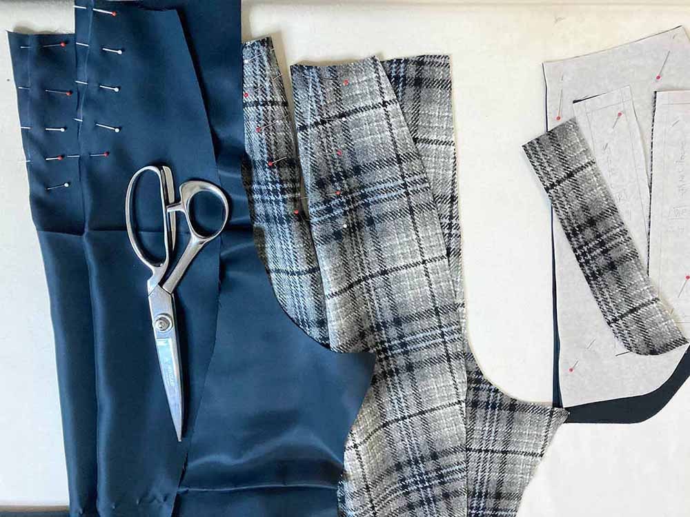 ・綺麗な水色のウインドウペーンチェックのスーツ生地があるのでロングのダブルジャケット+パンツスタイルの春スーツにしたい