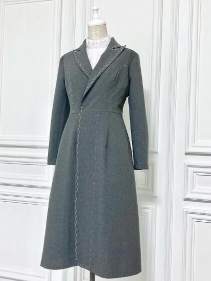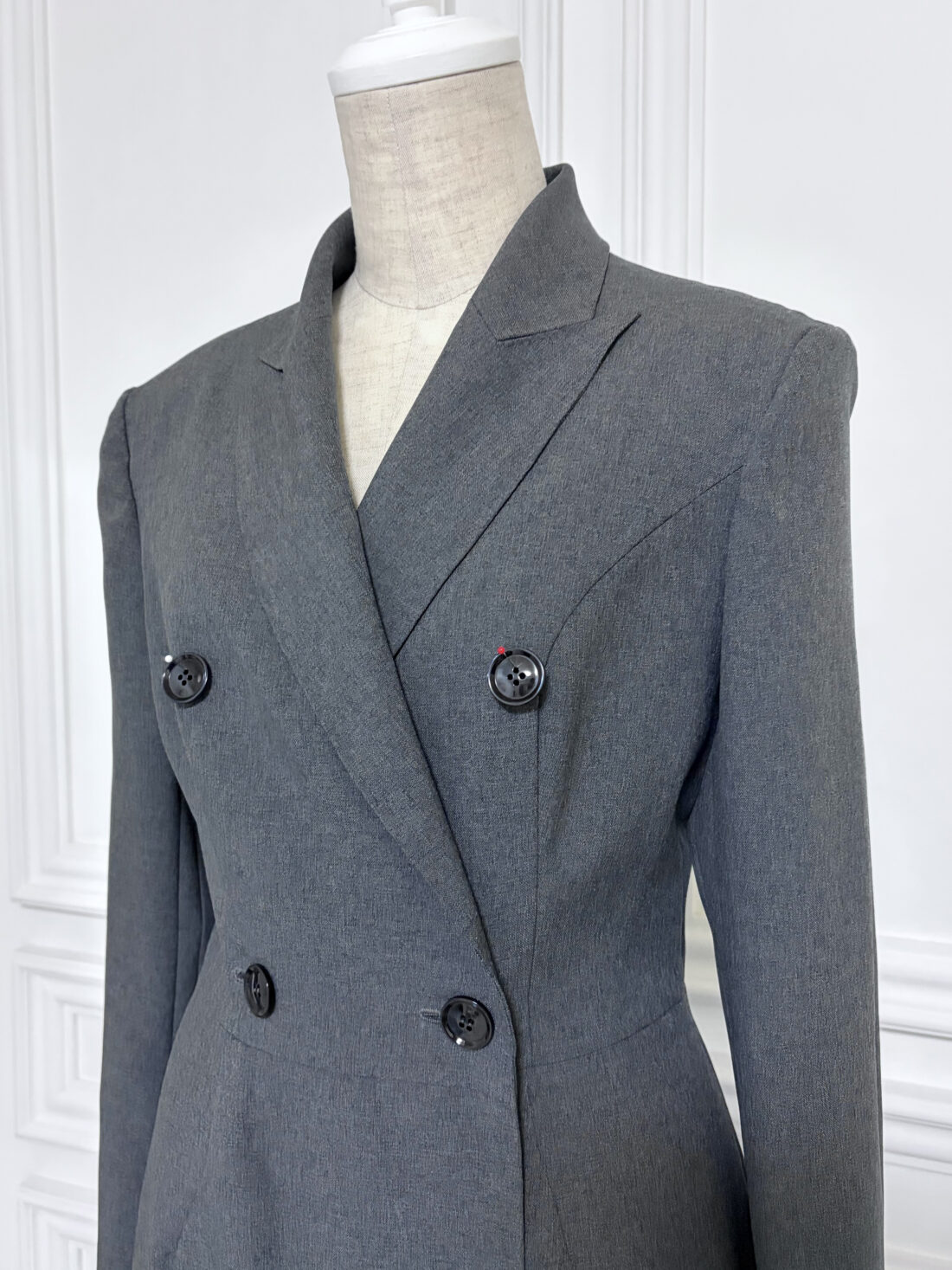 FormalSmooth生地を使用したダークグレーのダブルラペルドレスです。